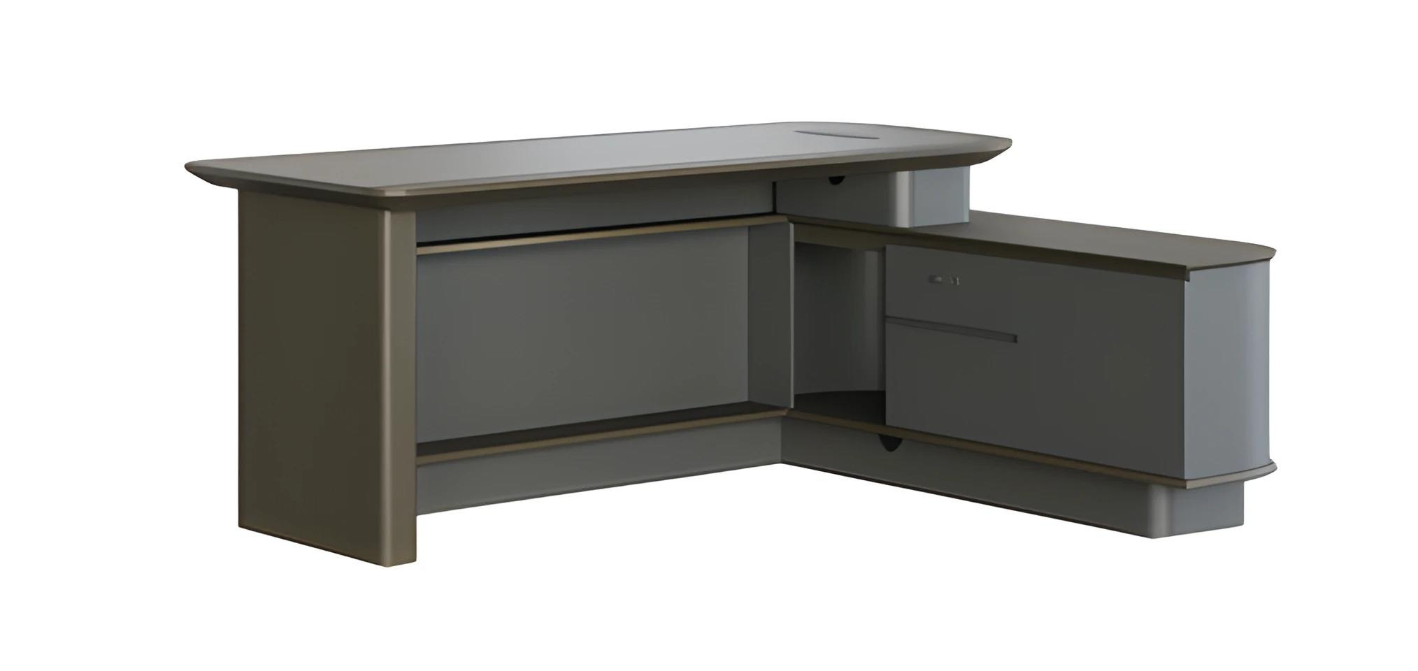 Moderna siva kotna miza z shrambo in elegantnimi prehodi za kable | xlposlovno.si