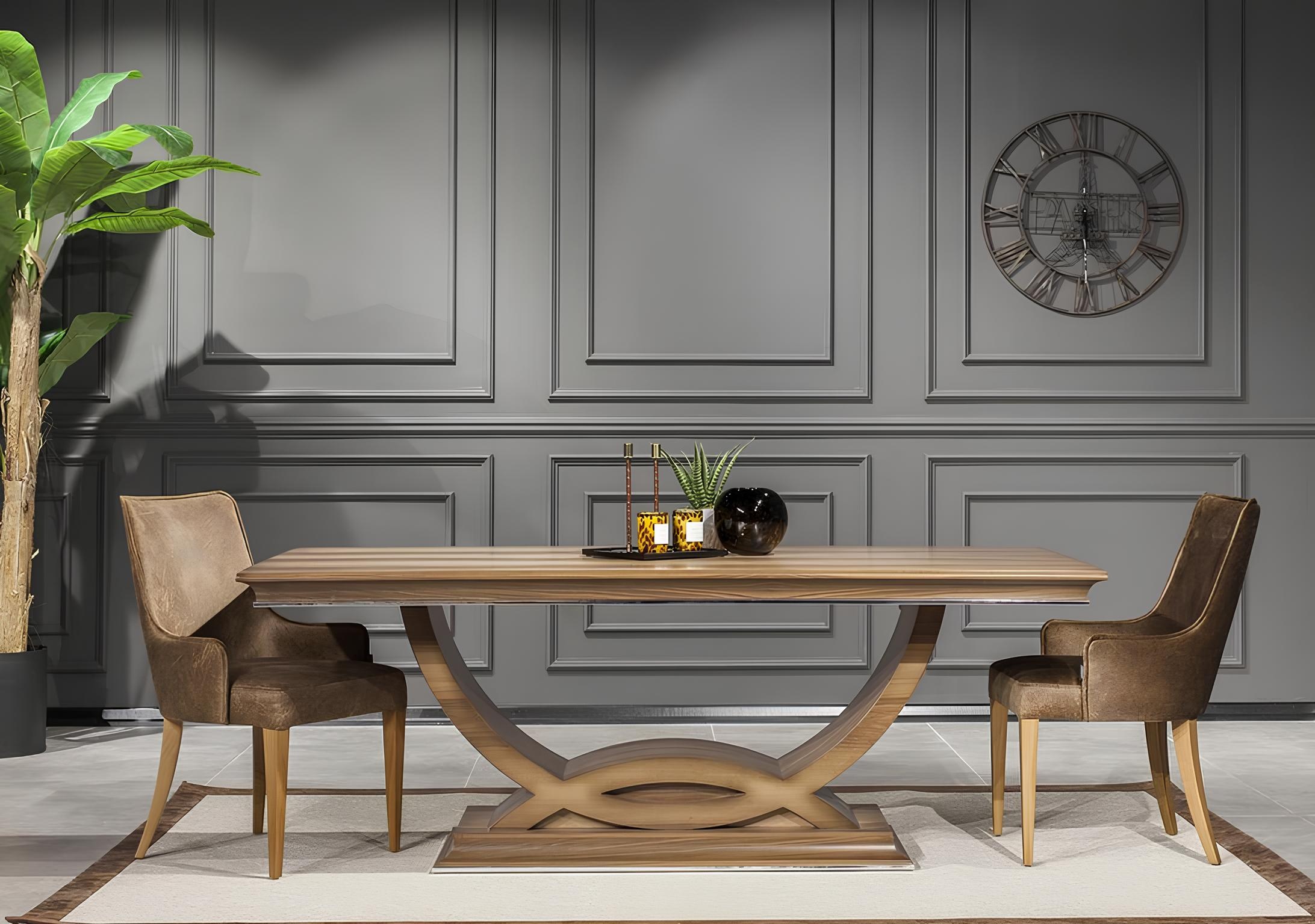Luksuzna jedilna miza s stoli in nočno omarico predstavlja vrhunec prefinjenosti in elegance. Izdelana iz vrhunskega rjavega poliestra, ta sedemdelen set prinaša toplino in sofisticiranost v vsak prostor. Njena oblikovana miza, skupaj s harmonično zasnovanimi stoli, ponuja udobje in stil, ki sta ključna za nepozabne družinske trenutke in obroke v krogu najdražjih. Nočna omarica dopolnjuje celotno estetiko, dodaja praktičnost in hkrati ohranja visoke standarde dizajna. Ta kosi pohištva so rezultat dvajsetletne tradicije ustvarjanja luksuznih notranjih prostorov, ki odražajo ekskluziven življenjski slog. Izberite ta set za dom, kjer se elegance sreča z udobjem.