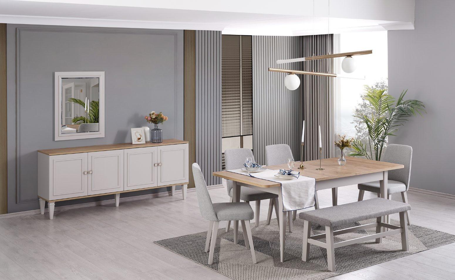 Entdecken Sie die Essgruppe Esszimmermöbel Set 8tlg in trendigem Grau von XL Moebel! Mit einem Esstisch, Stühlen, Hockern, einem Sideboard und einem eleganten Spiegel verwandelt dieses Set Ihr Esszimmer in einen stilvollen Rückzugsort. Der Esstisch ist erweiterbar und bietet Platz für gesellige Abende. Hergestellt aus hochwertigem Holz und Stoff, besticht dieses Set durch seine Qualität und Langlebigkeit. Holen Sie sich jetzt Ihre Esszimmer-Erneuerung im Landhausstil, Industriellen Look oder Modernem Design nach Hause!