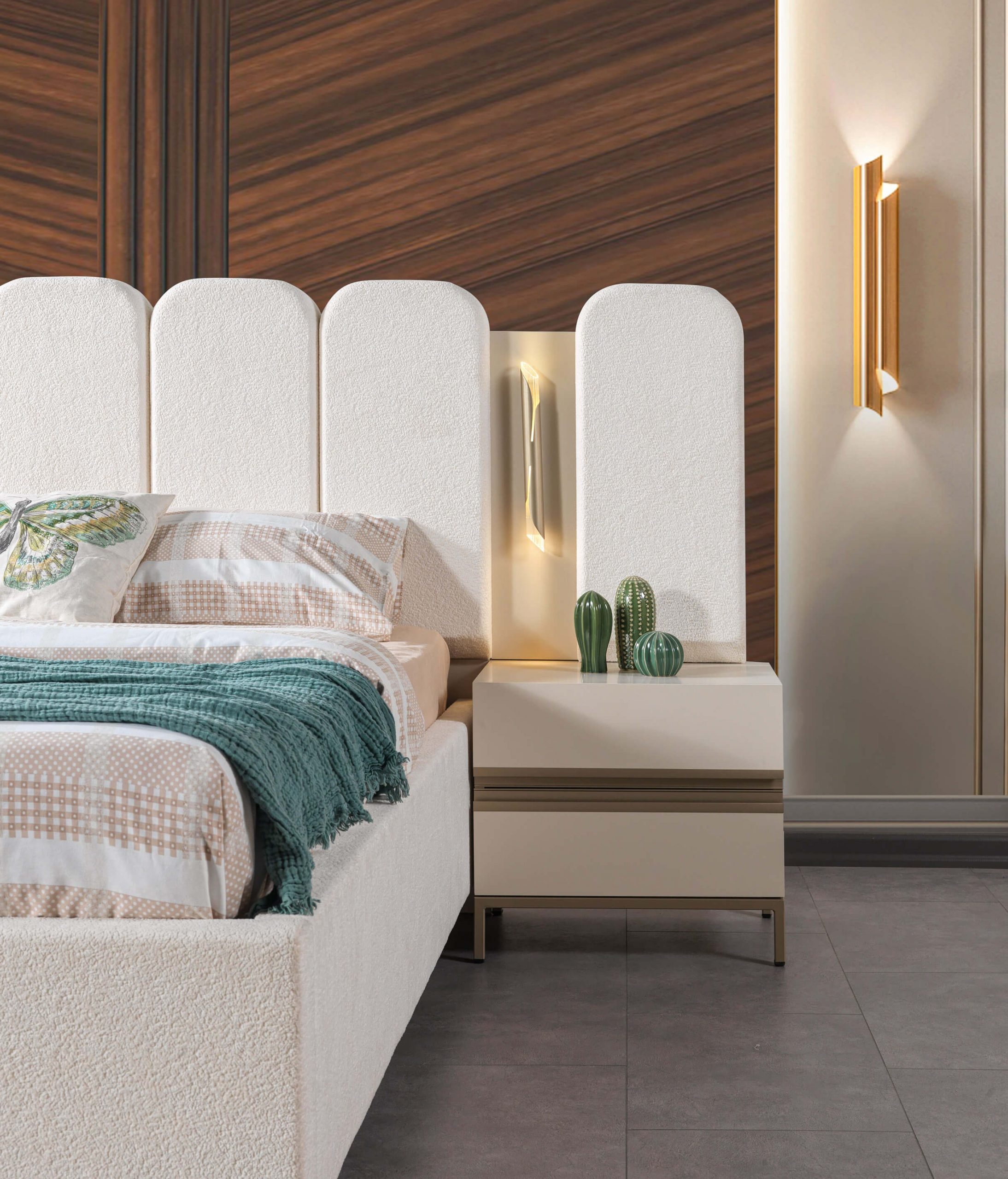 Elegantna nočna omarica prinaša prefinjeno preprostost v vašo spalnico. Z dimenzijami 58 x 42 x 52 cm se brez težav vključuje v vsak prostor, hkrati pa natančno odraža vašo izbiro premium življenjskega sloga. Njena bež barva in brezčasna zasnova izžarevata sofisticiranost in eleganco, kar jo dela popolno dopolnilo za vaše notranje opremljanje. V 20 letih naše tradicije v luksuznem pohištvu smo skrbno izbrali materiale, ki zagotavljajo trajnost in estetski užitek. Ta nočna omarica ni le funkcionalen kos pohištva, temveč tudi simbol vašega dobrega okusa in predanosti ekskluzivnosti. Izberite eleganco, ki jo prinaša.