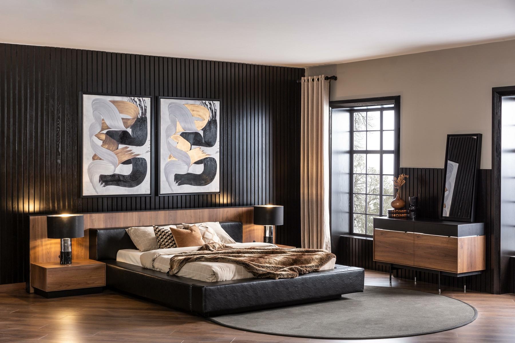 5-delni komplet pohištva za spalnico združuje brezčasno eleganco in sodobno funkcionalnost. Ta prefinjen set, ki vključuje posteljo, nočno omarico in komodo, je zasnovan za tiste, ki cenijo vrhunsko kakovost in estetsko dovršenost. Črna barva dodatkov poudarja sofisticiranost in prefinjenost, medtem ko skrbno izbrani materiali zagotavljajo dolgo življenjsko dobo in udobje. Vsak kos je skrbno oblikovan, da ustvari harmoničen ambient, ki odraža ekskluziven življenjski slog. V dvajsetih letih izkušenj je naš brand postavil nove standarde v svetu luksuznega pohištva, kar se odraža v tem kompletu, ki je idealna izbira za vašo spalnico.