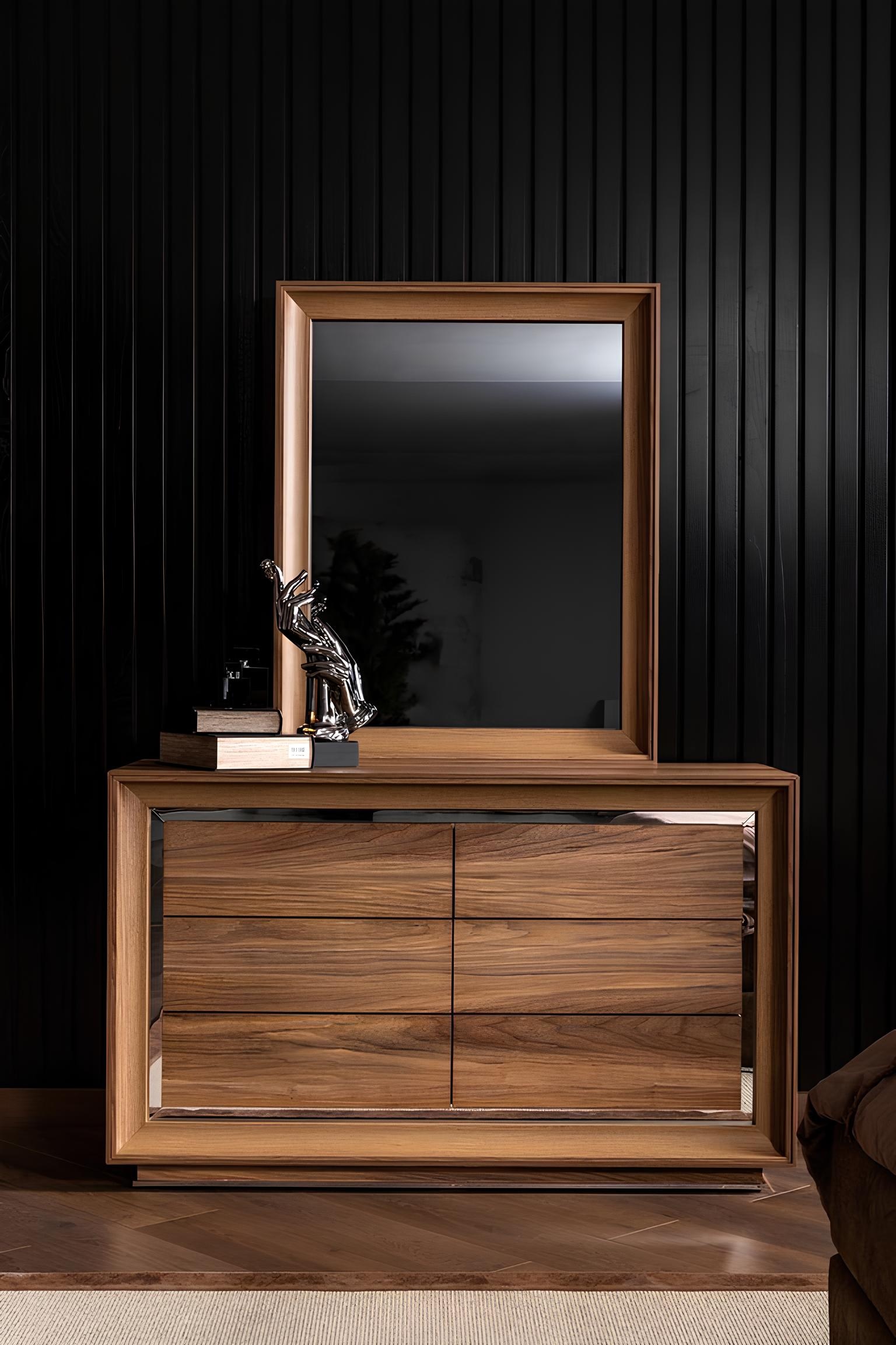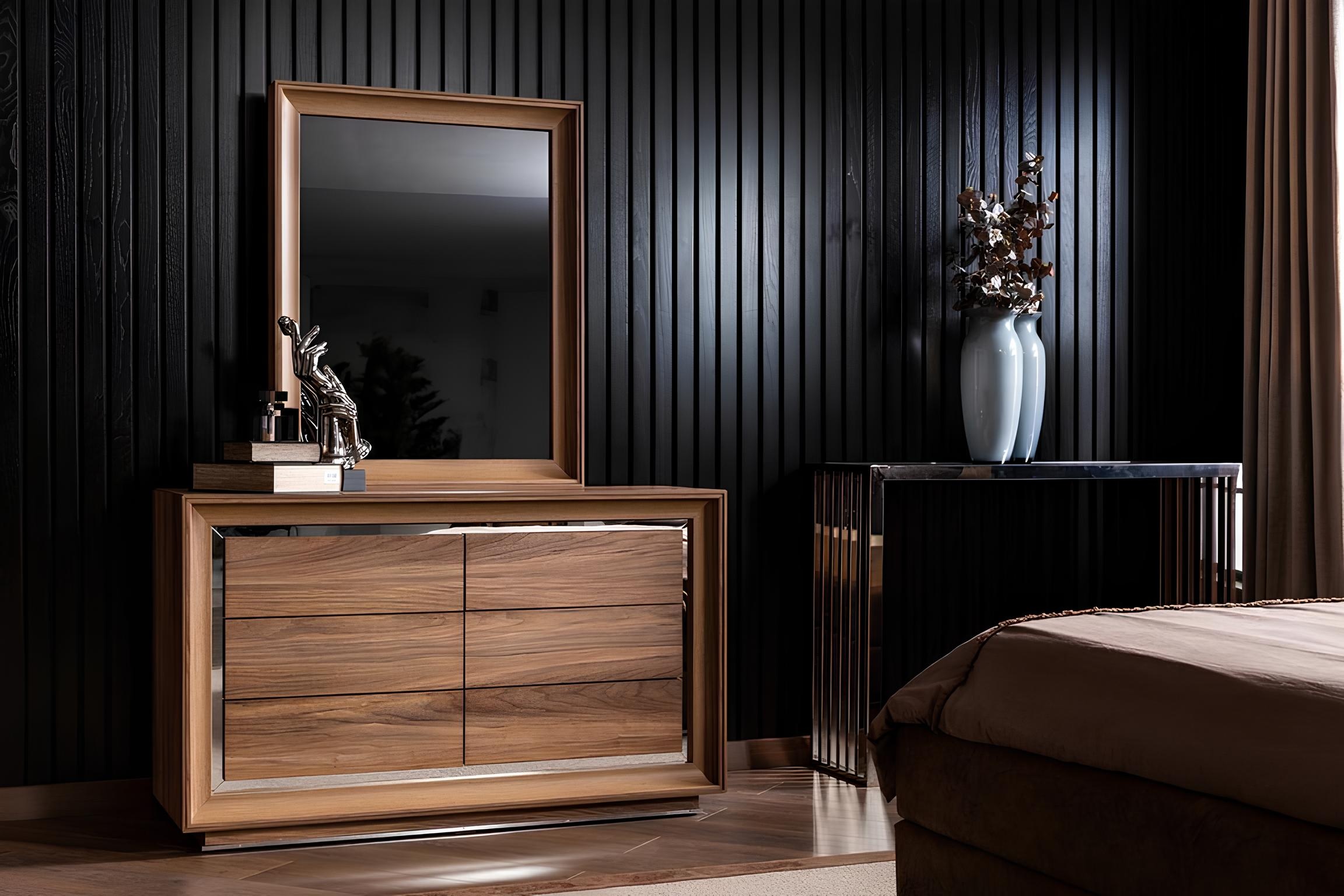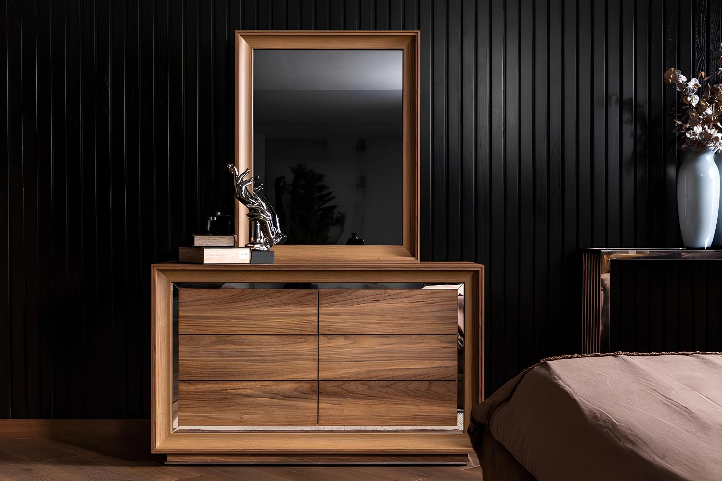 Idealna spalnica pohištvo set prinaša vrhunskega udobja in brezčasne elegance v vaše intimne prostore. Sestavljen iz omare, nočne omarice in postelje, ta petdelni set v bogati rjavi barvi izžareva sofisticiranost in prefinjenost. Vsak kos je skrbno zasnovan z mislijo na najvišje standarde kvalitete, kar zagotavlja dolgotrajno uporabnost in estetsko privlačnost. Oblikovanje se popolnoma prilega sodobnim trendom, hkrati pa ohranja klasične elemente, ki zagotavljajo občutek luksuza. Izberite ta set in ustvarite prostor, ki odraža vašo ekskluzivno življenjsko filozofijo ter omogoča nepozabno izkušnjo sprostitve in miru.