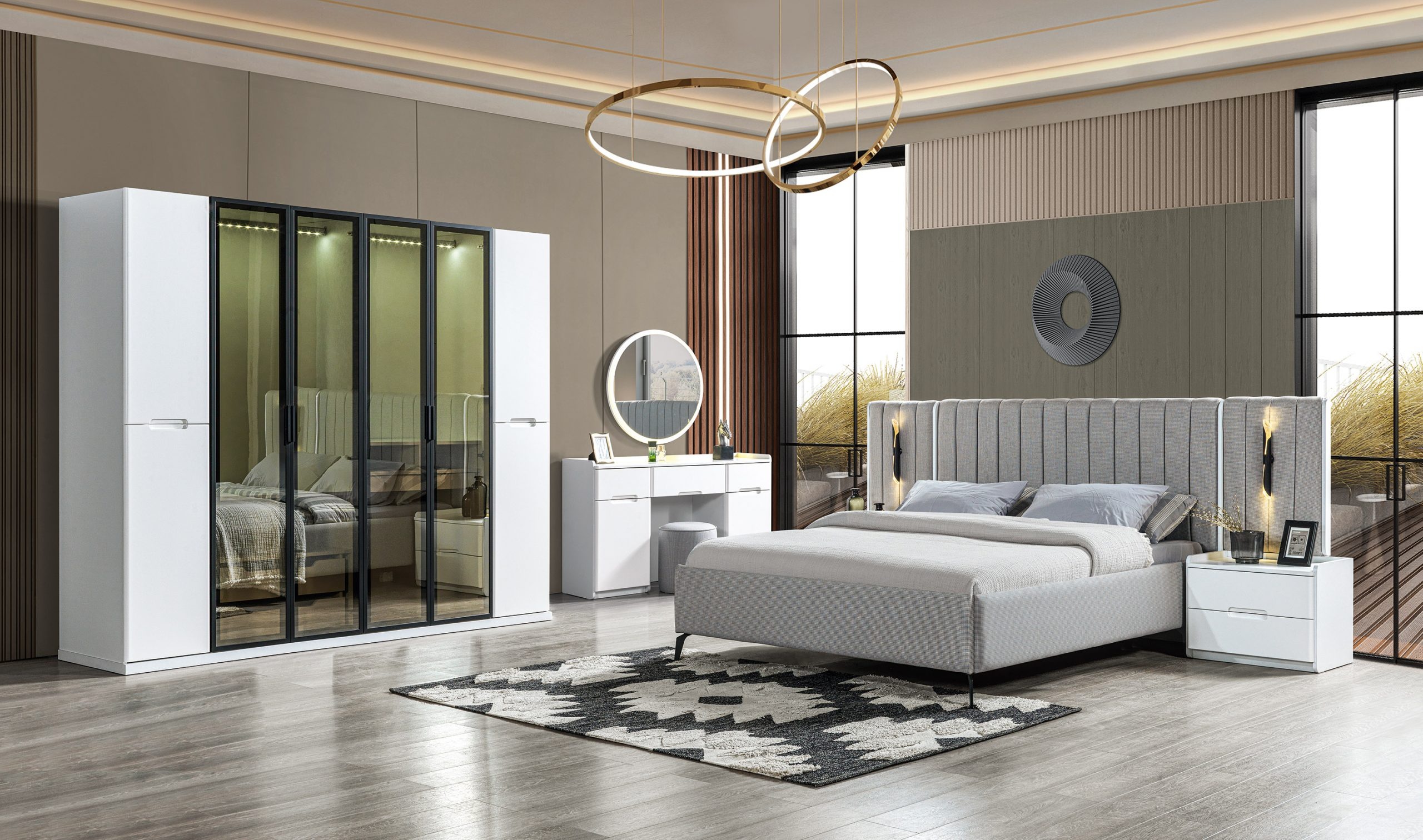 Komplet pohištva za spalnico v štirih delih združuje brezčasno eleganco in sodobno funkcionalnost. Postelja s prefinjenimi linijami in vrhunskim sivim lesom zagotavlja udobje in sofisticiranost, medtem ko omara s prostornim notranjim prostorom natančno organizira vaše osebne predmete. Nočna omarica, oblikovana z mislijo na estetiko, dopolnjuje celotni videz in nudi priročnost na dosegu roke. Ta skrbno zasnovan komplet je idealna izbira za tiste, ki si želijo ustvariti ekskluzivno domače okolje. Z več kot 20-letno tradicijo v luksuznem pohištvu predstavlja simbol prefinjenega okusa in življenjskega sloga, ki presega običajno.