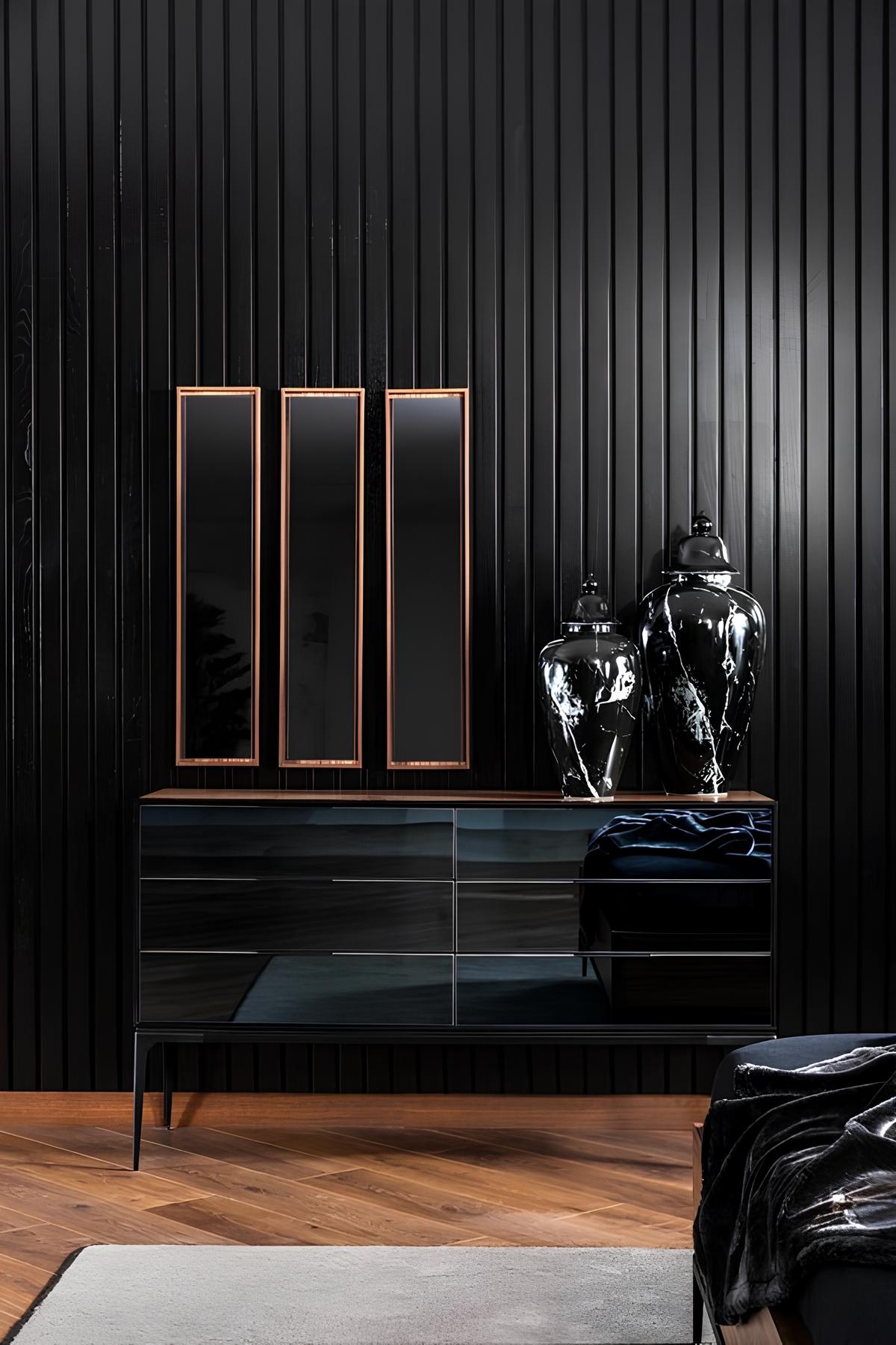 Luksuzni spalni pohištveni set združuje brezčasno eleganco in sodobno funkcionalnost, kar ga uvršča med vrhunskega v svojem razredu. Njegova črna barva in vrhunski materiali ustvarjajo sofisticirano vzdušje, ki navdušuje in pritegne poglede. Set obsega prostorno omaro, ki natančno izkorišča vsak centimeter prostora, ter posteljo, ki ponuja neprekosljivo udobje in podporo. Vsak detajl je skrbno oblikovan, da odraža ekskluzivnost in prestiž. S tem pohištvom boste v svojem domu ustvarili oazo miru in razkošja, ki bo zadovoljila tudi najzahtevnejše estete. Izbira tega seta je izraz vašega edinstvenega sloga in življenjskega standarda.