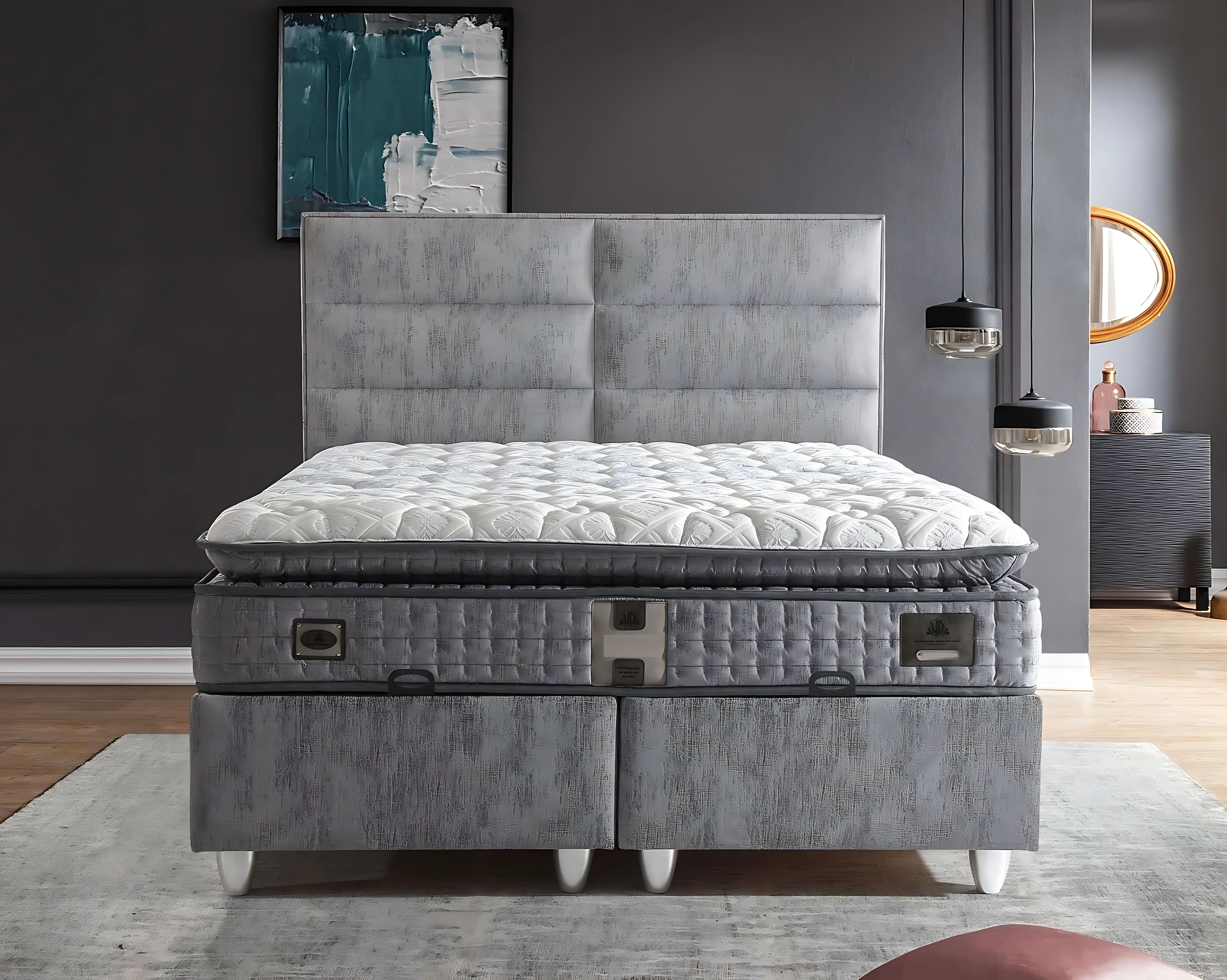 Postelja v moderni sivi tkanini z vzmetnico | xlposlovno.si