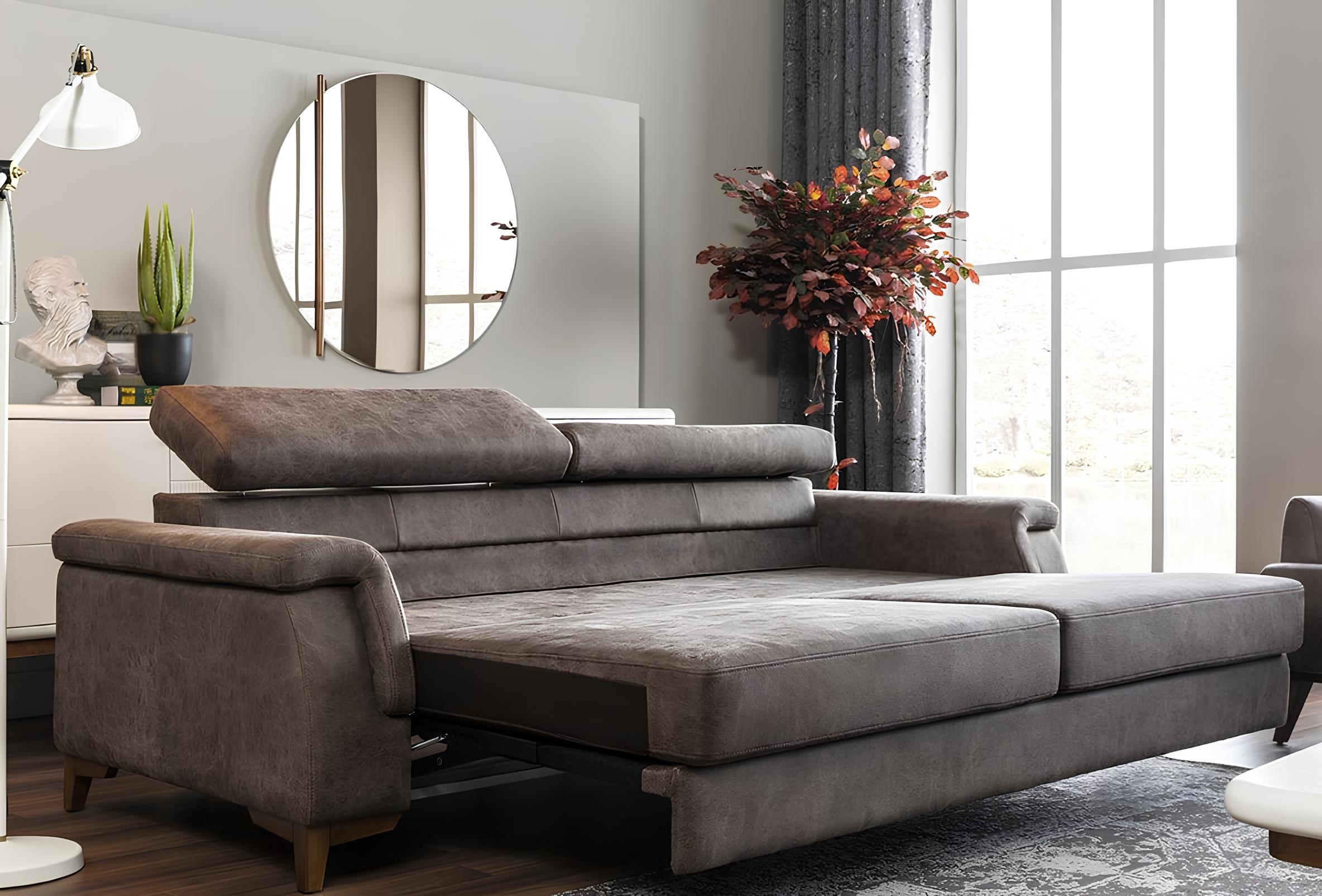 Siva kavč s tremi mesti in funkcijo postelje